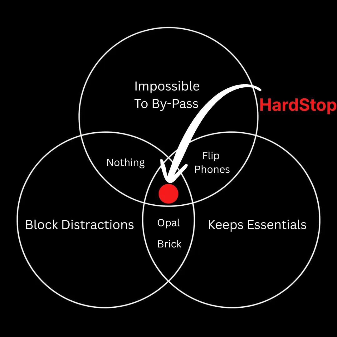HardStop uses iOS system-level restrictions that are architecturally impossible to bypass without factory resetting your entire phone. We're so confident you won't find a workaround that we'll pay you $10,000 if you do (without resetting your phone).